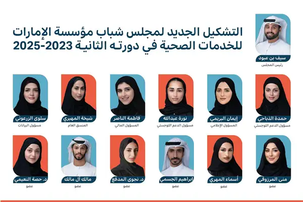 ضمن جهود ترسيخ رؤيتها نحو شباب قيادي وصحي، وتحقيق مستهدفات رسالتها لخلق فرص من الشباب وإلى الشباب، أعلنت مؤسسة الإمارات للخدمات الصحية عن التشكيل الجديد لمجلس شباب المؤسسة 2023 – 2025 وذلك بالتعاون مع وزارة الثقافة والشباب، ليعد امتداداً لجهودها الداعمة للشباب والتي تستثمر في طاقاتهم الإبداعية ومواصلة تمكينهم، وذلك ضمن سعيها وحرصها المتواصل على تنفيذ توجيهات قيادة دولة الإمارات الرشيدة في تمكين الشباب وتزويدهم بجميع الممكنات التي تسهم في تعزيز دورهم في المجتمع والمساهمة الفاعلة في الارتقاء بقدراتهم لخدمة الوطن من خلال رؤية استراتيجية طموحة تعكس التزامها بتعزيز دورهم الحيوي في تحقيق أهداف المؤسسة.