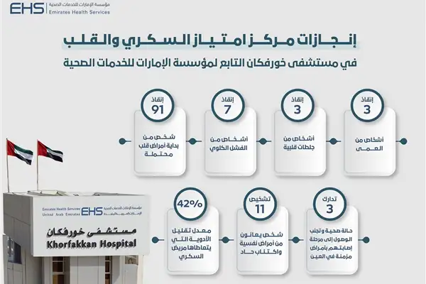 Khorfakkan Hospital, an Emirates Health Services (EHS) facility, has announced the accomplishments of its "Diabetes and Heart Centre of Excellence" since its inception in 2021 to date. This facility is regarded as a leading and exceptional centre for providing diabetes and heart treatment under one roof and during a single visit.